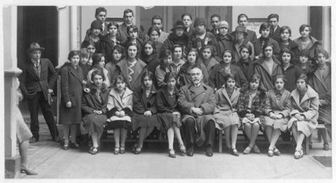 Positivo papel copia, monocromo, estructura formal retrato grupo, especialidad fotográfica registro. Sello en relieve de la firma del fotografo. Retrato de grupo de hombres y mujeres jóvenes. Al centro un hombre de barba con abrigo.