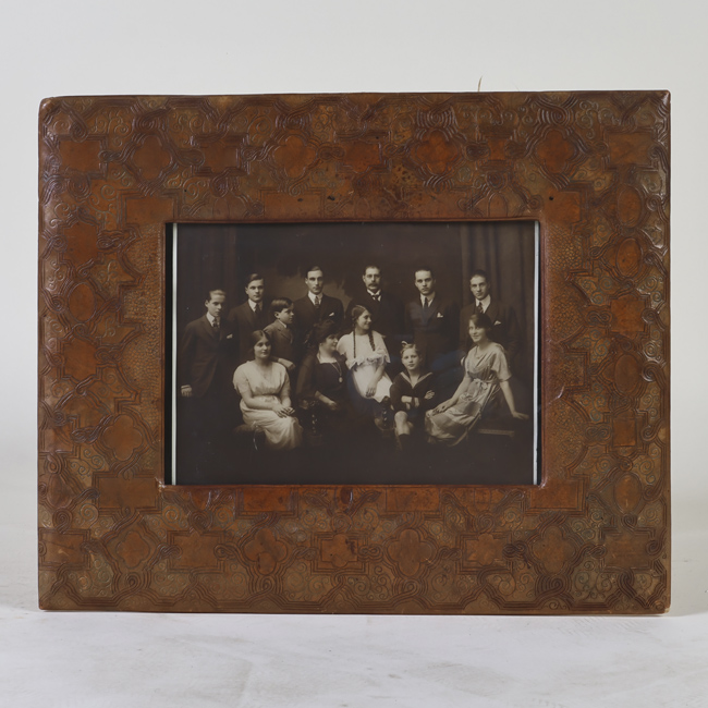 Copia fotografía monocroma en papel, formato horizontal. Retrato familiar, en el primer planos sentadas, cuatro mujeres con vestidos y un niño con traje de marino. A sus espaldas seis hombres vestidos de traje. Fotografía en marco tapizado de cuero estampado de color café rojizo.