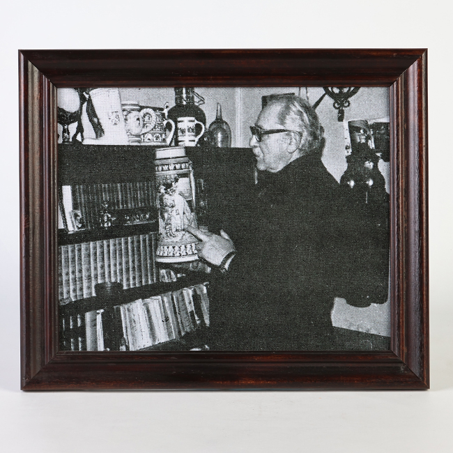 Fotografía de formato rectangular y disposición horizontal. Su composición se basa en el retrato de una figura masculina, que usa lentes, bigote y el pelo corto. Está de costado, sosteniendo un recipiente para beber. De fondo se ve un librero lleno y sobre él otros recipientes.