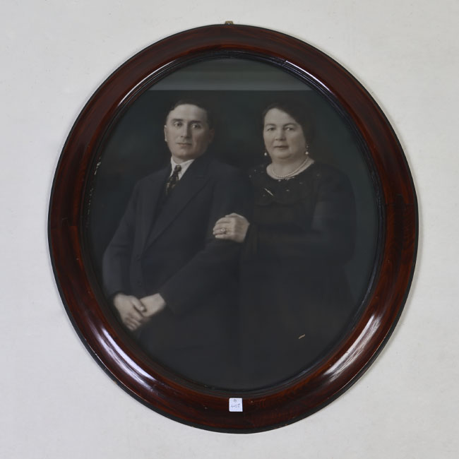 Fotografía ovalada de disposición vertical, donde se observa una pareja adulta, un hombre y una mujer, ambos de pie. El hombre viste de traje y la mujer un vestido largo, el pelo tomado y usa joyería.