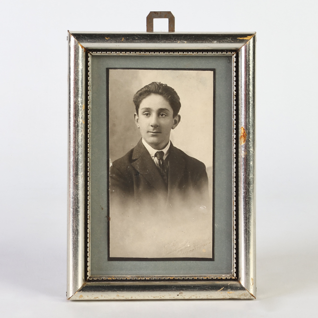 Retrato de medio cuerpo de una figura masculina con la mirada dirigida hacia un costado; viste de traje y tiene el cabello corto. Esta enmarcado en marco color plata.