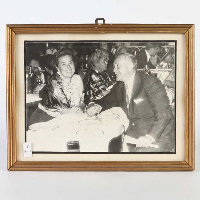 Fotografía en blanco y negro, donde en primer plano se ve una pareja de una figura femenina y una figura masculina, sentados en una mesa, ella sonríe a la cámara y él la mira a ella