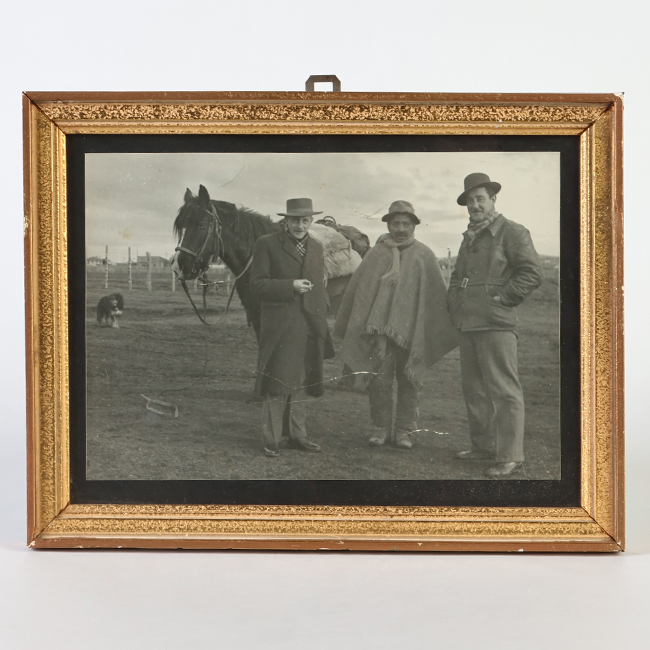 Fotografía de forma rectangular y disposición horizontal, donde se observan tres figuras masculinas de pie mirando a la cámara, atrás de ellos un caballo. Se encuentran en el exterior, en un campo. La fotografía esta enmarcada en marco dorado con decoraciones.
