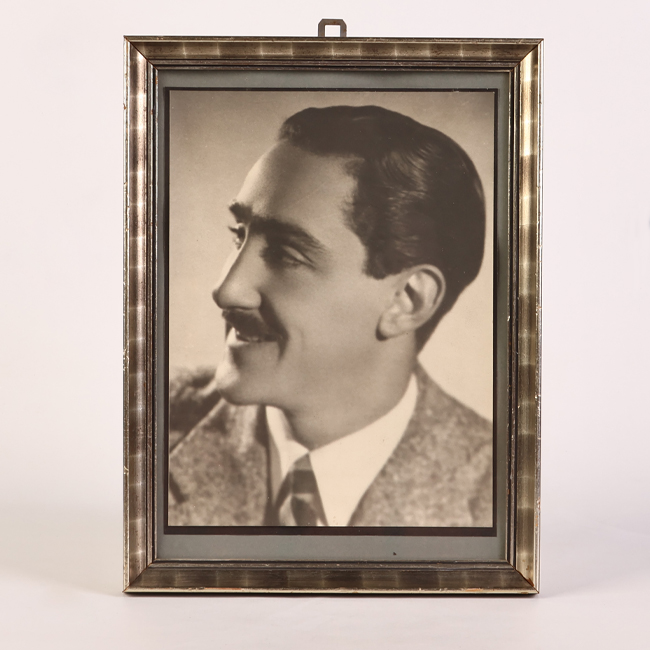 Fotografía de disposición vertical. Se observa una figura masculina desde el torso hacia arriba, su mirada se encuentra dirigida hacia un costado, viste de traje, usa el cabello corto y bigote. La fotografía se encuentra enmarcada en marco metálico.