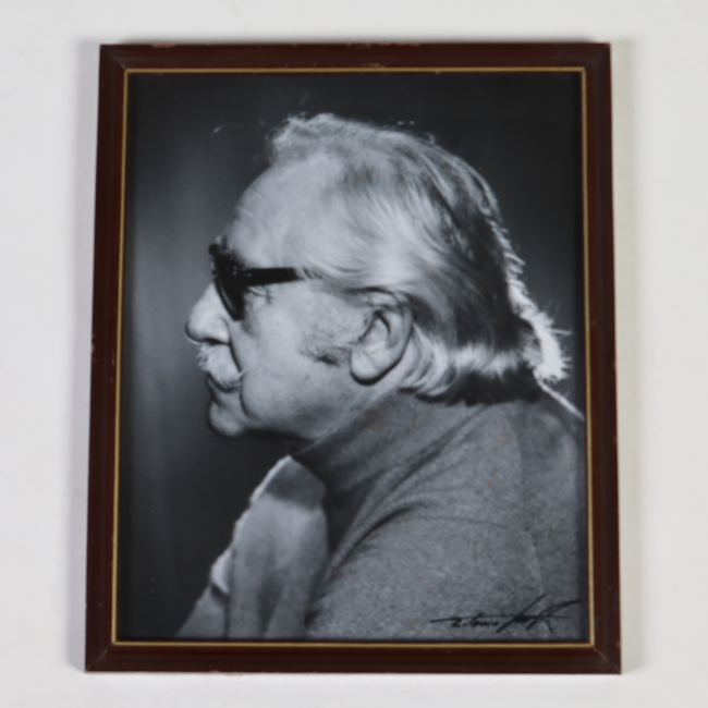 Fotografía en blanco y negro, retrato de una figura masculina, de perfil. Usa el cabello corto, lentes oscuros y beatle.