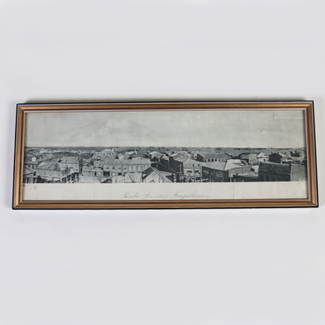 Fotografía panorámica en blanco y negro, de la ciudad de Punta Arenas.