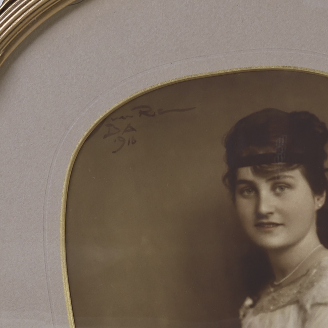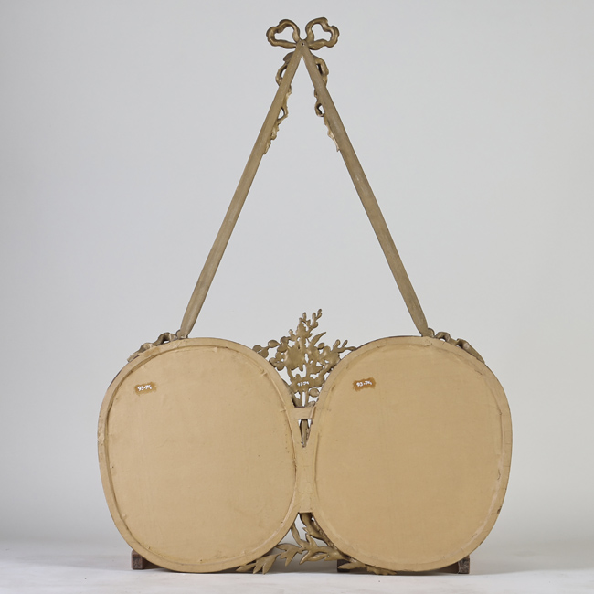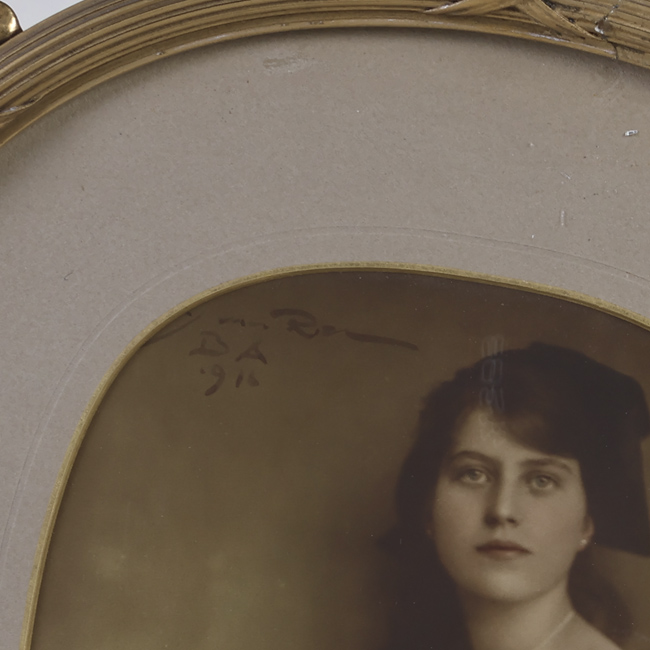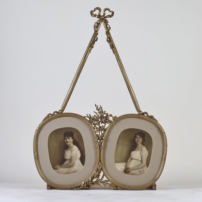 Copia fotográfica monocroma en positivo sobre soporte papel. Se trata de dos retratos enmarcados en formas ovaladas los que se encuentran unidos por una decoración de fitoformas rígidas, talladas en madera pintada y enyesada con relieves y calados. Los dos retratos individuales corresponden a mujeres jóvenes en un plano principal hasta la cintura, vertical, en el que se observa que ellas se encuentran sentadas con ambas manos posadas sobre su regazo orientadas en hacia su lado derecho. Las jóvenes tienen el cabello largo y ondulado, recogido sobre la nuca y lo dejan caer sobre su hombro y espalda.