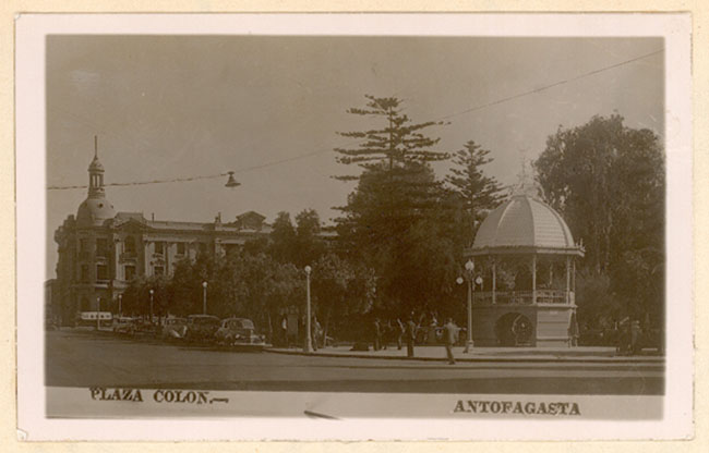 Vista de la Plaza Colón de Antofagasta. En primer plano de observa el kiosco de retreta donación de la colonia croata a la ciudad. Inmediatamente detrás, de observan los árboles de la plaza y el edificio de Correos y Telégrafos. Destacan automóviles, peatones, faroles y cables del tendido eléctrico. Lugar: Antofagasta (Chile). Materia: Arquitectura y urbanismo. Plazas.