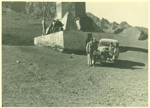 Impresión fotográfica digitalizada, de formato rectangular y disposición horizontal, en blanco y negro. Composición en base a un paisaje cordillerano, en primer plano una ladera con un automóvil oscuro junto a tres figuras masculinas. En segundo plano una estructura con base rectangular y una torre en la parte superior sobre la base un grupo de figuras masculinas. Al fondo montañas irregulares y de tonalidad media, en la parte superior y al a derecha cielo claro.