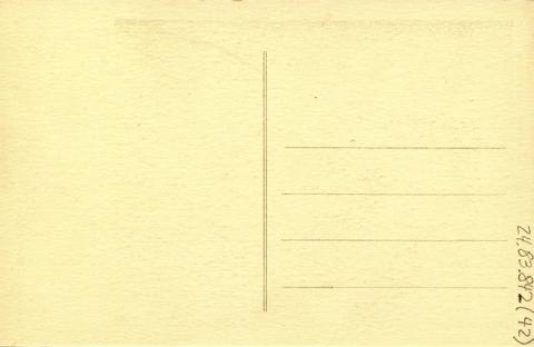 Reproducción impresa, de formato rectangular, en blanco y negro. Posee diferentes características en anverso y reverso, El anverso está dispuesto verticalmente y se compone por la reproducción de una obra visual bidimensional de formato rectangular y de disposición vertical. La obra visual se estructura por el retrato de tres figuras masculinas de medio cuerpo. De izquierda a derecha. Se observa el rostro y cuello de un hombre de perfil dirigido a la derecha de la imagen, de rostro anciano y mirada dirigida a la derecha. Sobre su frente posee un papel claro con escritos manuscritos en tonalidad oscura. En el centro de imagen se encuentra un hombre joven dispuesto frontalmente al espectador y mirada perdida a la derecha, tiene cabello de tonalidad medio, ondulado y largo, tiene un corona con espina alrededor de su cabeza y detrás un círculo claro. Tiene el torso desnudo y en el cuello tiene una soga anudada, las manos se encuentran juntas frente al pecho anudadas por una soga. Al extremo derecho de la imagen una figura masculina de perfil dirigido a la izquierda, mirada también dirigida al a izquierda. Usa un turbante claro sobre la cabeza, posee una nariz prominente y boca entre abierta mostrando parte de los dientes. El fondo es oscuro con pequeños carteles claros rectangulares con escritos manuscritos oscuros. Posee inscripciones en el borde del extremo inferior y la parte superior de la tarjeta postal dispuestas horizontalmente y escritas con tipología imprenta en negro. Al reverso se dispone horizontalmente y no posee ningún tipo de inscripción, solo se observa una línea vertical en el centro de la imagen y cuatro líneas paralelas dispuestas horizontalmente en el costado derecho de la imagen, estas son perpendiculares a la línea central.