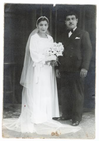 Retrato de dos figuras femenina y masculina de pie al interior de habitación. Ella lleva un vestido blanco y largo con velo transparente y largo, en sus manos sostiene un ramo de flores. Él tiene bigotes, viste un traje oscuro y humita.