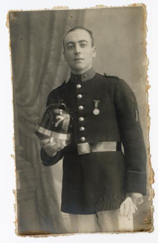 Objeto bidimensional de formato rectangular y disposición vertical. Composición en base a imagen monocroma sobre soporte papel. Retrato individual de figura masculina adulta dispuesta de pie, viste traje de bombero, en la mano derecha porta un casco con el número 7. Bordes irregulares
