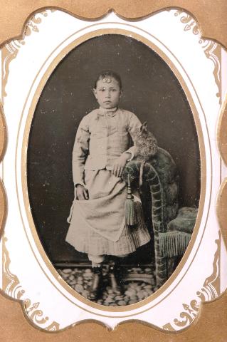 Composición en base a figura infantil femenina de cuerpo entero, de píe frente a la cámara. Viste traje, usa el cabello recogido y apoya su brazo izquierdo en una silla.