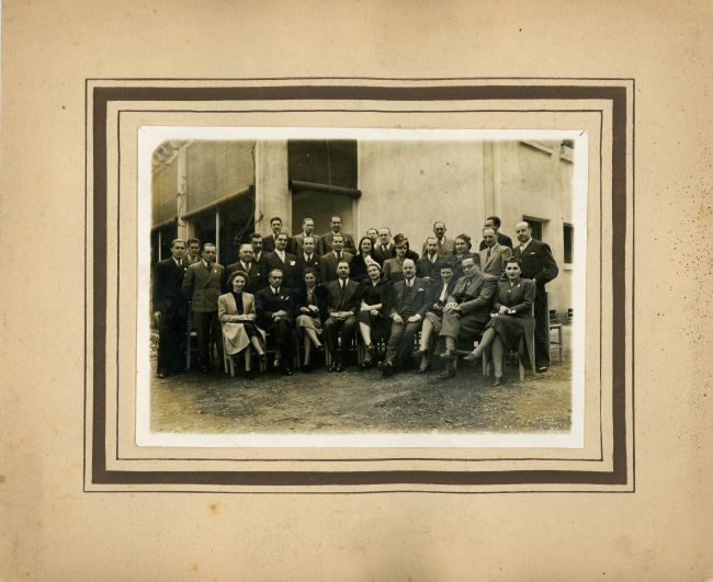 Fotografía en blanco y negro montada sobre cartulina decorativa de bordes concéntricos en tonos marrón, blanco y beige. La imagen muestra un grupo numeroso de personas, compuesto por hombres y mujeres adultos, dispuestos en tres planos principales: una fila frontal sentada, una segunda fila de pie y una tercera fila elevada o en segundo plano, también de pie. Todos visten indumentaria formal, destacando trajes oscuros, abrigos largos, corbatas y sombreros. Las mujeres llevan vestidos y abrigos, algunas con sombrero o peinados recogidos. El grupo se encuentra en un espacio exterior, sobre suelo de tierra, frente a un edificio de fachada simple, de superficie lisa y ventanas rectangulares, parcialmente cubiertas por persianas. La iluminación natural es uniforme, sin sombras marcadas. La fotografía presenta bordes blancos visibles.