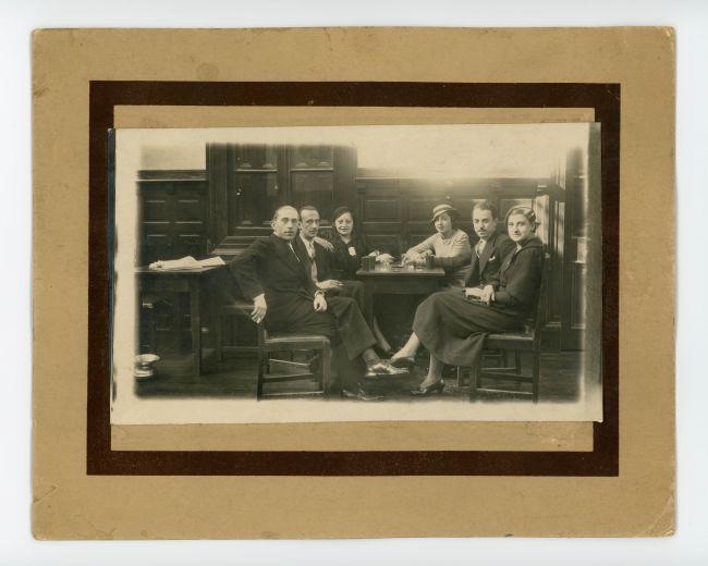 Fotografía en blanco y negro de formato rectangular y orientación horizontal. Retrata un grupo de seis personas que miran hacia la cámara, sentadas en sillas de madera alrededor de una mesa rectangular en una habitación cerrada, son tres hombres que visten trajes oscuros con corbata, y tres mujeres que visten traje de dos piezas con faldas por debajo de la rodilla y sombrero. La sala tiene paredes revestidas con paneles de madera oscura, sobre la mesa hay pequeños vasos, un cenicero y un par de vasos para el juego de cacho. Sobre una mesa junto hay un par de periódicos doblados. La fotografía está montada en una cartulina con doble marco decorativo, uno claro y otro oscuro.