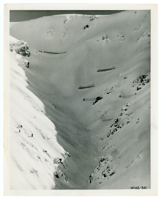 Fotografía en blanco y negro de formato rectangular en posición vertical. Muestra un empinado terreno montañoso completamente cubierto de nieve. La imagen enfoca una quebrada profunda delimitada por dos laderas donde se aprecian tanto acumulaciones de nieve como afloramientos rocosos. Distribuidos a lo largo de las laderas se observan estructuras metálicas de retención de nieve, con forma de rejas verticales y diagonales. En la esquina inferior derecha aparece el número “N° AE-341”.