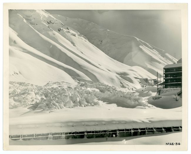 Fotografía en blanco y negro de formato rectangular con orientación vertical. Muestra un paisaje de alta montaña cubierto de nieve. En el plano inferior se observa una amplia superficie nevada que se extiende en dirección hacia el centro de la imagen. Al fondo se distinguen las laderas empinadas de un cordón montañoso, también cubiertas de nieve, que descienden de manera abrupta hacia el valle. En el costado derecho de la imagen se ubica una construcción de gran tamaño y varios pisos, parcialmente cubierta por la nieve en su nivel inferior. En primer plano, en la franja inferior de la fotografía, aparece parte de una estructura lineal semejante a un túnel o pasarela techada, cubierta también por nieve y hielo. En la esquina inferior derecha se distingue el código impreso “N°AE-316”.