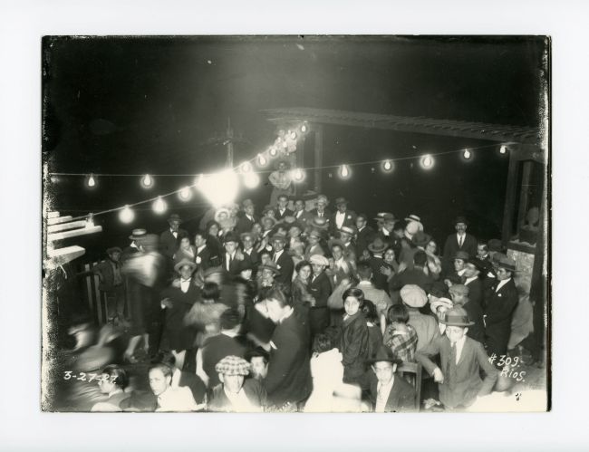 Fotografía en blanco y negro de formato rectangular en posición horizontal. Muestra una multitud de personas en una fiesta nocturna al aire libre. La imagen está tomada desde un ángulo elevado, enfocando a un grupo compacto de alrededor de 50 personas, la mayoría hombres con algunos niños y mujeres dispersas, algunos que miran a la cámara. Las personas están vestidas con ropa formal, los hombres y niños llevan sombreros, trajes oscuros, camisas con cuello y corbatas. Las mujeres usan vestidos y blusas de manga larga. La escena está iluminada por una cadena de bombillas colgadas sobre la multitud. Hay cierto movimiento visible en la parte inferior izquierda de la imagen, lo que genera un ligero efecto borroso en algunas figuras. El fondo es oscuro, con algunas estructuras visibles a los lados, probablemente muros o barandales, que delimitan el espacio donde se encuentran los asistentes. En la esquina inferior izquierda se lee "3-27-27" y a la derecha "# 309.Rios."