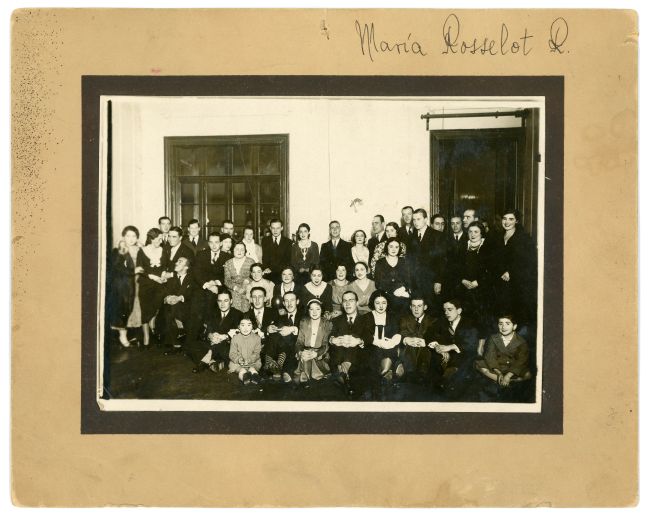 Fotografía en blanco y negro de formato rectangular y posición horizontal, con un marco negro alrededor y montada sobre un soporte gris. Muestra a un grupo grande de personas, hombres, mujeres y niños, distribuidas en cuatro filas para un retrato grupal. Todos vestidos con ropa formal como trajes, vestidos largos, blusas y corbatas, en su mayoría tonos oscuros. La escena se desarrolla en un interior con paredes claras y una puerta abierta a la derecha. Sobre el marco negro, en la parte superior derecha, hay una inscripción manuscrita que dice "María Rosselot R.".