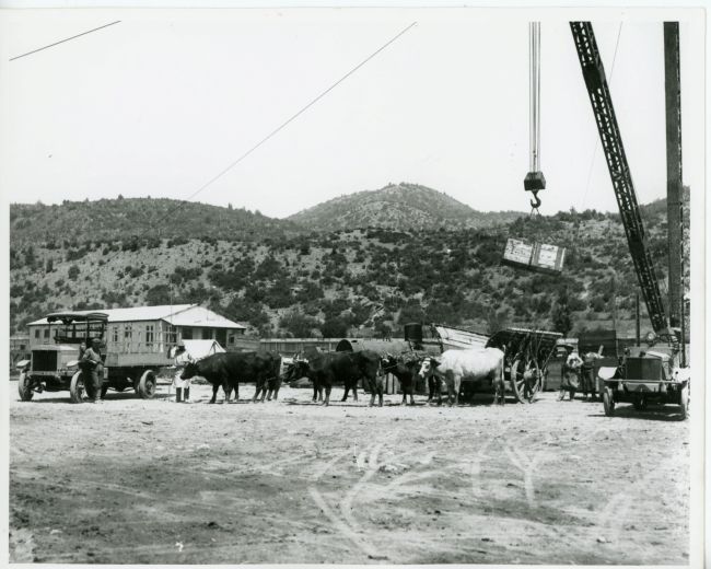 Obra en blanco y negro en formato vertical de posición horizontal. Muestra una escena al aire libre en un paisaje abierto de colinas cubiertas de arbustos. En primer plano al centro, sobre un terreno de tierra, se observa una escena de trabajo, un grupo de bueyes alineados, algunos de ellos amarrados a una carreta con ruedas grandes, entre ellos algunos hombres están de pie junto a los bueyes, vistiendo ropa de trabajo, botas y sombrero. En ambos extremos de la imagen, se ven dos vehículos, hacia la derecha en segundo plano una casa de madera, y hacia la derecha, una grúa con una caja suspendida en el aire sobre la carreta.