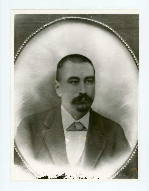 Fotografía en blanco y negro de formato ovalado sobre un soporte rectangular en gris. Muestra la imagen de un retrato formal de busto de un hombre que está enmarcado sobre un fondo blanco en un óvalo decorativo con borde texturizado. Tiene cabello corto y oscuro, bigote espeso y barba. Viste un traje oscuro con camisa clara y corbata de lazo. El fondo es difuso, lo que resalta la figura central.