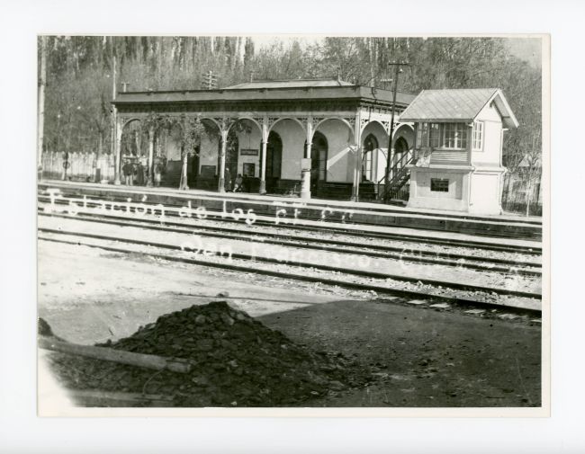 Imagen en blanco y negro de formato rectangular, con orientación horizontal y borde blanco alrededor. En primer plano, se observa un montón de tierra junto a una herramienta. En el centro, atraviesan varias vías de tren paralelas que conducen hacia una estación ferroviaria al fondo. La estación es un edificio rectangular con columnas y arcos decorativos en su fachada, que sostienen un techo plano. A la derecha de la estación, hay una caseta elevada con ventanas y una escalera exterior. Al fondo, detrás del edificio, se aprecian árboles altos y delgados. Sobre la imagen, al centro, se distinguen algunas letras de color blanco, y se lee "Estación de los".