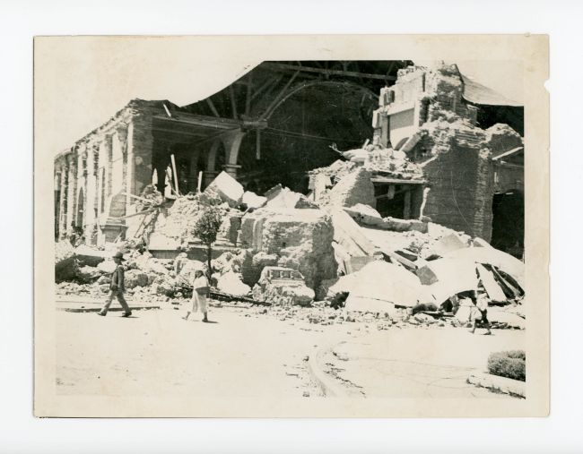 Imagen en blanco y negro, de formato rectangular y orientación horizontal, con márgenes blancos en su contorno. La imagen muestra una escena urbana, con un edificio de gran tamaño parcialmente colapsado. La estructura dañada, deja ver parte de una arquitectura clásica con columnas y arcos visibles, que presenta severos daños en su fachada y techumbre, con muros derrumbados y escombros apilados en el suelo. En primer plano, y frente a la construcción, se observa un espacio vacío donde caminan individualmente tres personas.