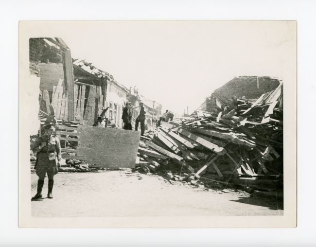 Imagen en blanco y negro de formato rectangular en posición horizontal. Composición centrada en escena urbana al aire libre. En primer plano, en la parte inferior izquierda, se ve una figura masculina de pie, mirando hacia el frente y que viste uniforme. A la derecha, se ve una acumulación de escombros de gran tamaño dispuestos en forma caótica y en pendiente. En el plano medio, al centro y hacia el fondo, se distinguen varias personas de pie sobre los escombros. A ambos lados de la calle, se observan edificaciones de un piso, en su mayoría destruidas o severamente dañadas, con muros derrumbados, techumbres colapsadas y estructuras internas expuestas.