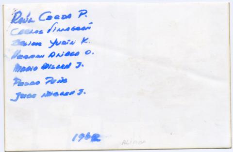 Copia positiva papel de formato rectangular con disposición horizontal e imagen en blanco y negro. Composición en base a retrato grupal en interior de figuras masculinas de pie, seis de ellos visten uniforme compuesto por una chaqueta oscura con cinturón, pantalón blanco y corbata.