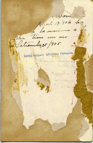 | Ramón Gallardo Gallardo  Aurora Carmona Torres | Reverso, centrado | Inscripción escrita con lápiz mina y parcialmente legible |