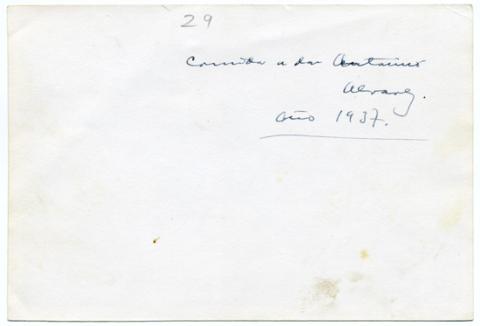 Copia positiva en papel de formato rectangular con disposición horizontal e imagen en blanco y negro. Composición en base a escena interior con un grupo de figuras masculinas la mayoría sedentes, que visten traje con corbata, en torno a mesas con mantel blanco y alimentos. Las figuras miran hacia la cámara.