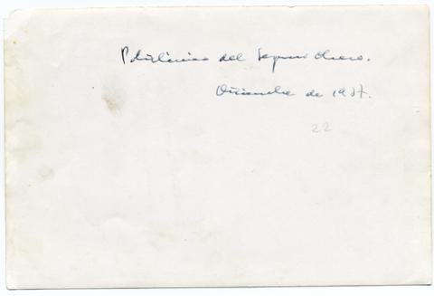 Copia positiva papel de formato rectangular con disposición horizontal e imagen en blanco y negro. Retrato grupal de figuras femeninas y masculinas, algunas se encuentran sentadas y otras de pie. Las figuras en el tercio superior de la imagen se encuentran difuminados en un halo de luz. En el tercio superior del reverso presenta texto manuscrito. en dos líneas.