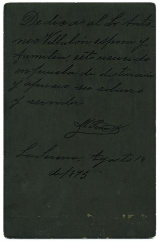 | Dedica al Sr. Antonio Villalón, esposa y familia, este recuerdo en prueba de distinción y aprecio su sobrino y servidor    M Peña V La Serena, Agosto 19 de 1895 | Reverso | Texto manuscrito |