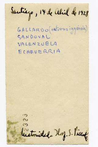 Copia positiva en papel de formato rectangular con disposición horizontal e imagen en blanco y negro. Composición en base a cuatro figuras masculinas de pie sobre una escalera delante de un edificio. Visten trajes largos de color blanco.
