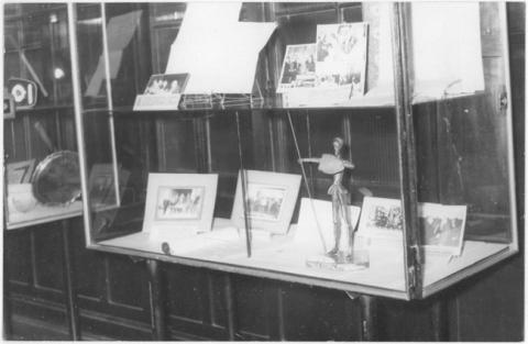 Positivo papel copia, monocromo, estructura formal escena, especialidad fotográfica registro. Vitrina donde se puede observar una serie de fotografías y una pequeña escultura de quijote.
