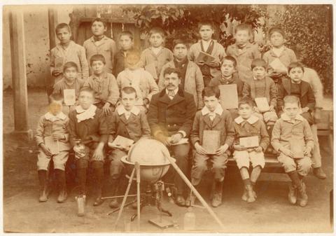 Positivo papel copia, monocromo, estructura formal retrato de grupo, especialidad fotográfica registro. Plano general de un grupo de niños con sus útiles, libros y un globo terráqueo.