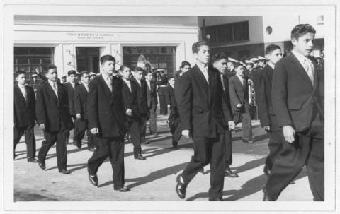 Positivo papel copia, monocromo, estructura formal escena, especialidad fotográfica registro. Toma fotográfica de grupo de hombres uniformados que desfilan por la calle.
