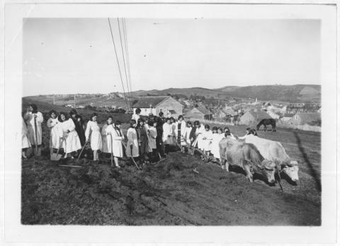 Positivo papel copia, monocromo, estructura formal escena, especialidad fotográfica registro. Toma fotográfica de exterior donde un grupo de mujeres de delantal preparan arado junto a dos animales.