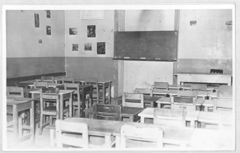 Positivo papel copia, monocromo, estructura formal bodegón, especialidad fotográfica registro. Toma fotográfica de una sala de clases con pupitres y una pizarra.