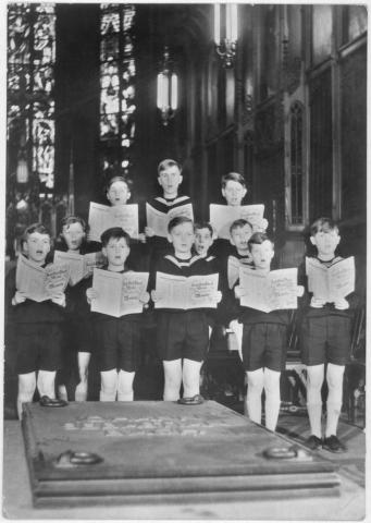 Positivo papel copia, monocromo, estructura formal retrato de grupo, especialidad fotográfica registro. Retrato de niños cantando uniformados dentro de una iglesia, ordenados en filas, en sus manos cancionero.