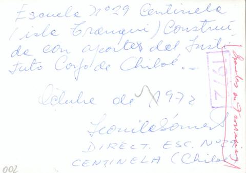 Escuela N° 29 Centinela (Isla Tranqui). Construida con el aporte del Instituto Corfo de Chiloé. Octubre de 1972. Se observa también una firma difícil de leer y bajo ella: Direct. Esc. N° 29 Centinela (Chiloé)