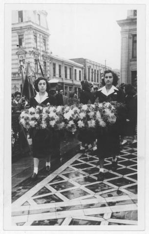 Ofrenda Floral depositada al Pie del Monumento A Los Heroes. Liceo Nº1 de Valparaiso, 21/5/1950. Lugar: Valparaíso. Materia: Cultura y educación. Manifestacion. Persona o grupo representado: 21 de mayo; Liceo Nº1 de Niñas, Valparaíso.