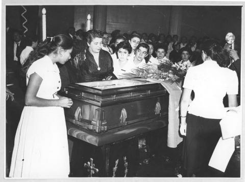 Positivo papel copia, monocromo, estructura formal escena, especialidad fotográfica registro. Un grupo de alumnas y una mujer observando a la poeta en su ataúd.