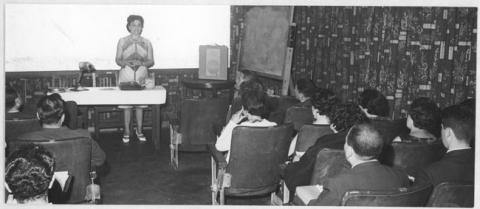 Positivo papel copia, monocromo, estructura formal escena, especialidad fotográfica registro. Vista interior de sala de cine. delante de telón, un mujer se dirige al público.