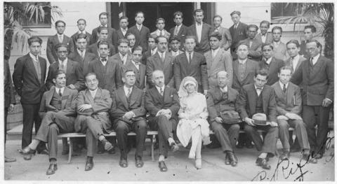 Positivo papel copia, monocromo, estructura formal retrato de grupo, especialidad fotográfica registro. Plano general de un grupo de hombres. Al centro una novicia. Todos en una de las entradas de edificio.