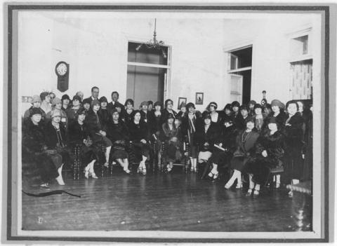 Positivo papel copia, monocromo, estructura formal retrato de grupo, especialidad fotográfica registro. Retrato de grupo de mujeres y hombres , en un salón, con vestimenta formal , mujeres con sombreros.