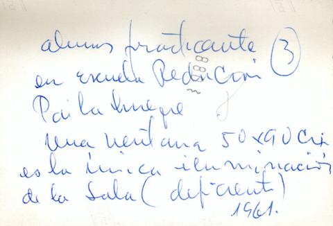 Alumno practicante en Escuela Reducción Pailahueque. Una ventana 50x90 cm es la única iluminación de la sala (deficiente) 1961.