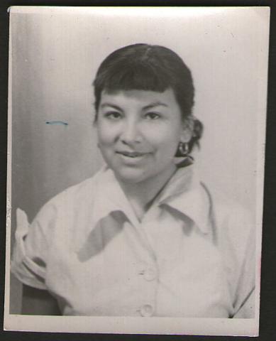 Positivo, monocromo, estructura formal retrato individual, especialidad fotográfica registro. Plano medio de una mujer usando una camisa. Tiene él pelo recogido y usa unos aros.