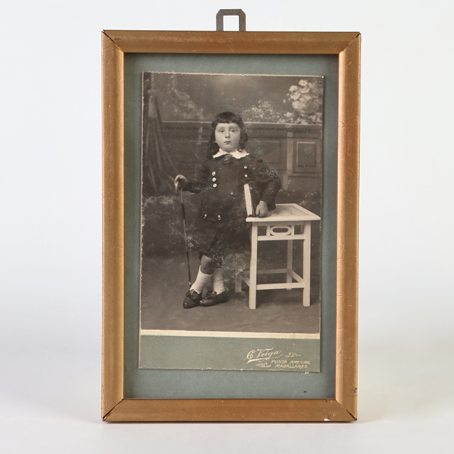 Fotografía de formato rectangular y disposición vertical. Donde se observa una figura infantil femenina mirando a la cámara, está de pie y sostiene con un brazo un bastón y con el otro brazo un libro, esta ligeramente apoyada en una mesa. Al pie de la foto se lee la firma C. Veiga, Punta Arenas, Magallanes.