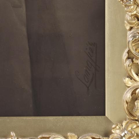 Marco rectangular de madera pintada en tono claro con aplicaciones de roleos vegetales en yeso dorado.